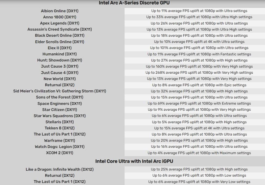 Кроме того, драйвер повышает производительность в трёх играх для процессоров Core Ultra, которые имеют iGPU на той же архитектуре, что и текущие адаптеры Arc. Тут речь идёт о повышении на 6–25%.