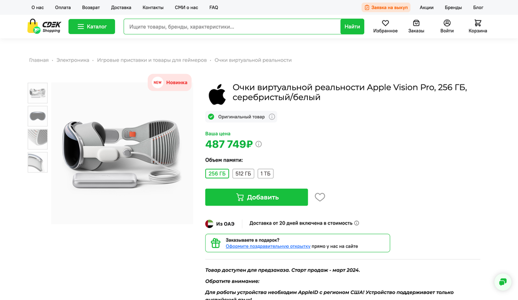 В России уже можно заказать новейшую гарнитуру виртуальной реальности Apple Vision Pro. Сервис CDEK.Shopping предлагает новинку с доставкой из ОАЭ в трёх вариациях встроенной памяти.