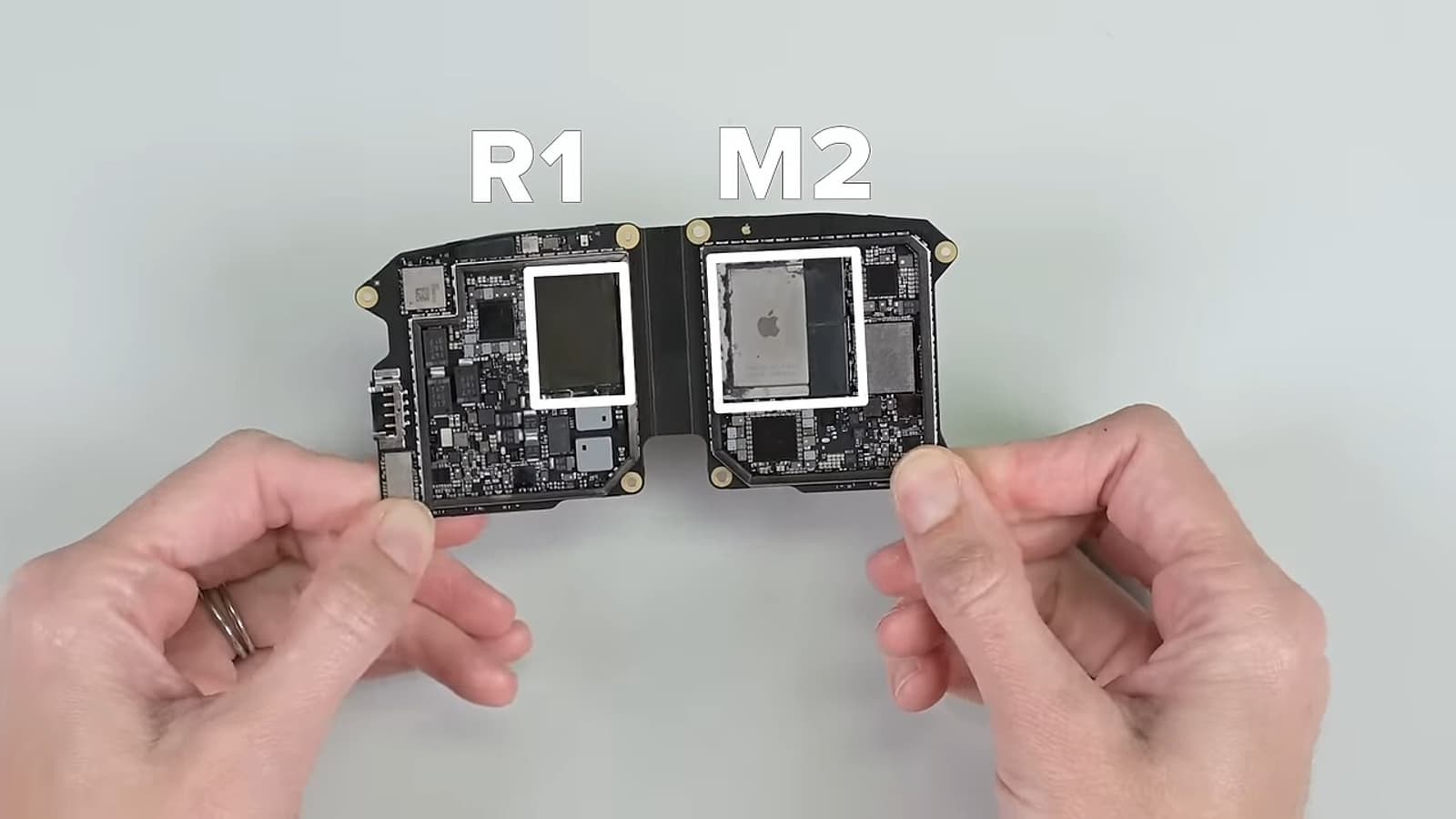 Можно оценить и системную плату новинки. Она состоит из двух половин, соединённых гибким шлейфом. На одной из половин установлена привычная по Mac однокристальная система Apple M2, которая кажется весьма габаритной для такого устройства. На второй разместилась SoC Apple R1, которая также выделяется достаточно большим кристаллом.