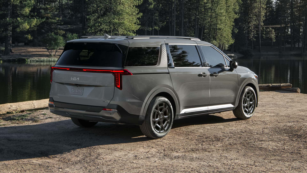 Kia Carnival 2025 действительно напоминает новый Sorento, он получил большую прямоугольную решётку Kia в окружении кубических фар и светодиодных ходовых огней автопроизводителя. Также установлены новые задние фонари. Сбоку видны раздвижные боковые двери, которые напоминают, что на самом деле это переднеприводный минивэн.
