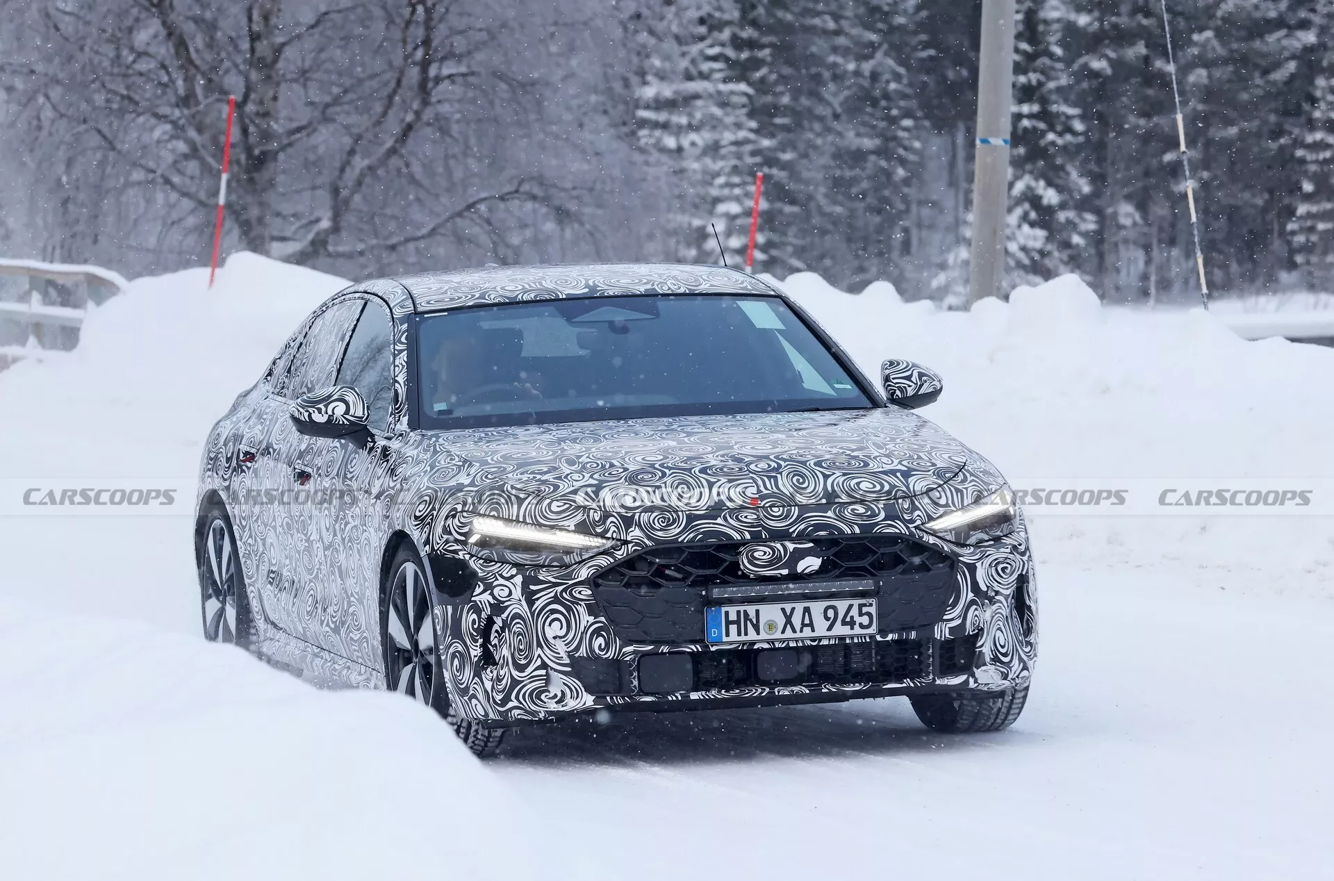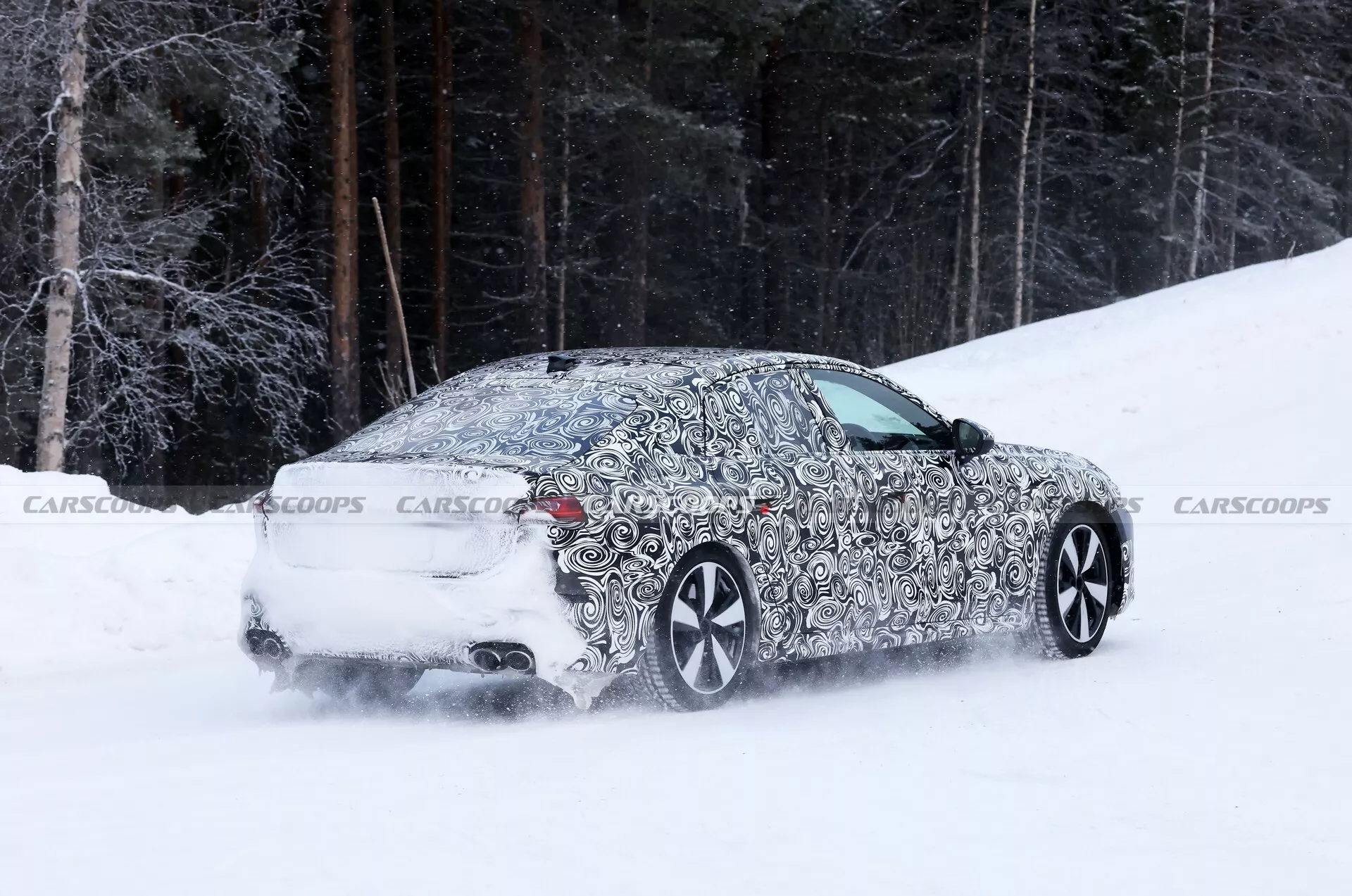Также заметны новые полускрытые дверные ручки, установленные заподлицо. Задняя часть частично скрыта снегом, но можно рассмотреть тонкие задние фонари. Автомобиль также оснащён закруглённым задним бампером и знакомой выхлопной системой с четырьмя патрубками.
