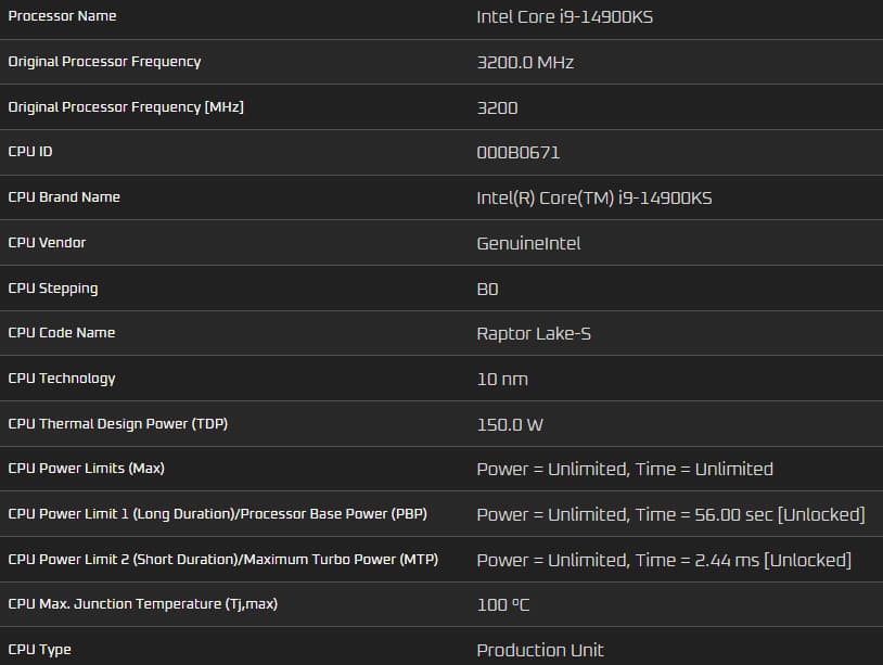 По конфигурации Core i9-14900KS не отличается от Core i9-14900K или Core i9-14900KF: у него 8 высокопроизводительных ядер и 16 энергоэффективных, CPU может выполнять 32 потока одновременно. Но частота Core i9-14900KS повышена до 6,2 ГГ, а значение TDP составляет 150 Вт (PL1) против 125 Вт у Core i9-14900K.