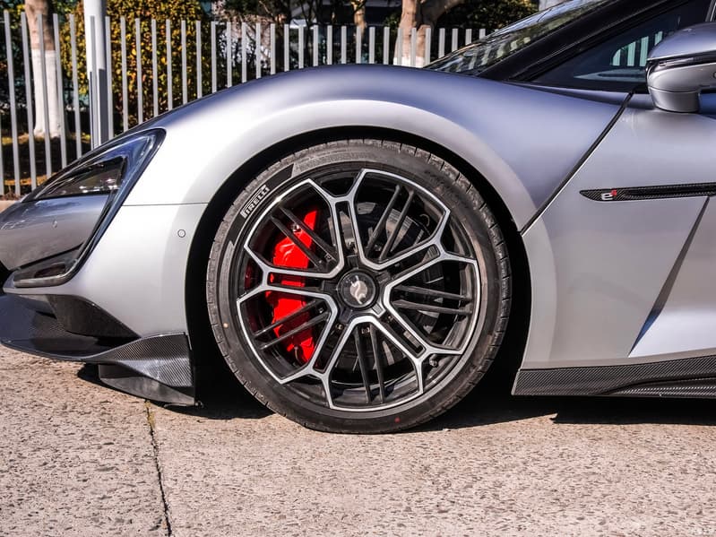 По фото понятно, что спорткар немаленький: габариты составляют 4966 х 2029 х 1338 мм, колесная база – 2900 мм. Спереди установлены колеса 275/35 R21, сзади – 325/30 R21. Покрышки на серийной версии – Pirelli.
