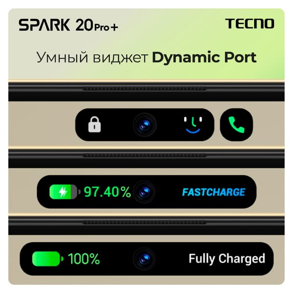 В Spark 20 Pro+ установлен аккумулятор 5000 мА·ч, поддерживается быстрая зарядка 33 Вт. Spark 20 Pro+ работает под управлением HiOS 13.6 на базе Android 14.