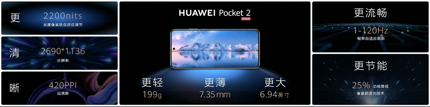 Huawei Pocket 2 получил экран OLED с диагональю 6,94 дюйма, разрешением 2690 × 1136 пикселей, кадровой частотой 120 Гц и максимальной яркостью 2200 кд/кв.м. Аппарат получил в очередной раз улучшенные петли. Сейчас они стали более плоскими, что позволило уменьшить толщину.