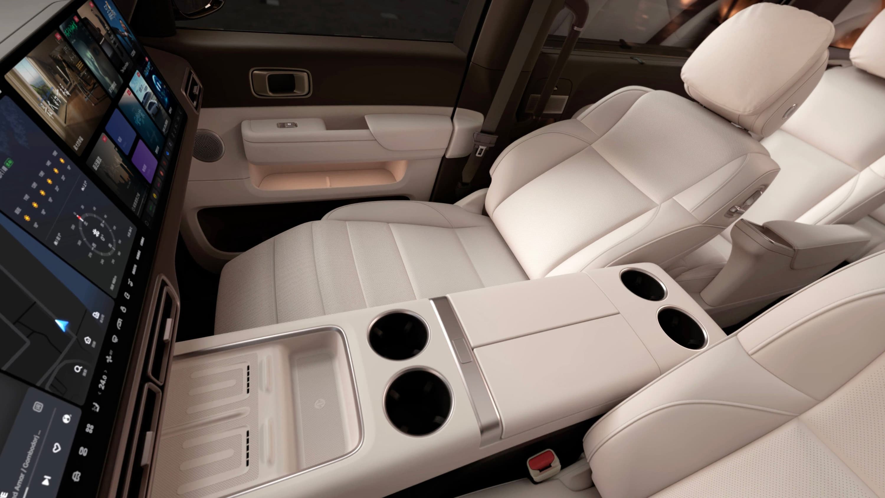 Передняя часть выглядит так же, как у кроссоверов Li Auto, и это ожидаемо. На передней панели большие сдвоенные экраны — в составе медиасистемы и для переднего пассажира. На центральном тоннеле широкий подлокотник, две пары подстаканников и две беспроводные зарядки мощностью 50 Вт для смартфонов.