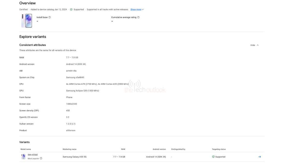 В базе Google Play Console засветился готовящийся к выпуску Samsung Galaxy A55. Подтверждены ключевые характеристики модели: смартфон, обозначенный каталожным номером SM-A556E, получит фирменную SoC Exynos 1480 с GPU Samsung Xclipse 530, Android 14, 8 ГБ ОЗУ и экран с разрешением Full HD+.