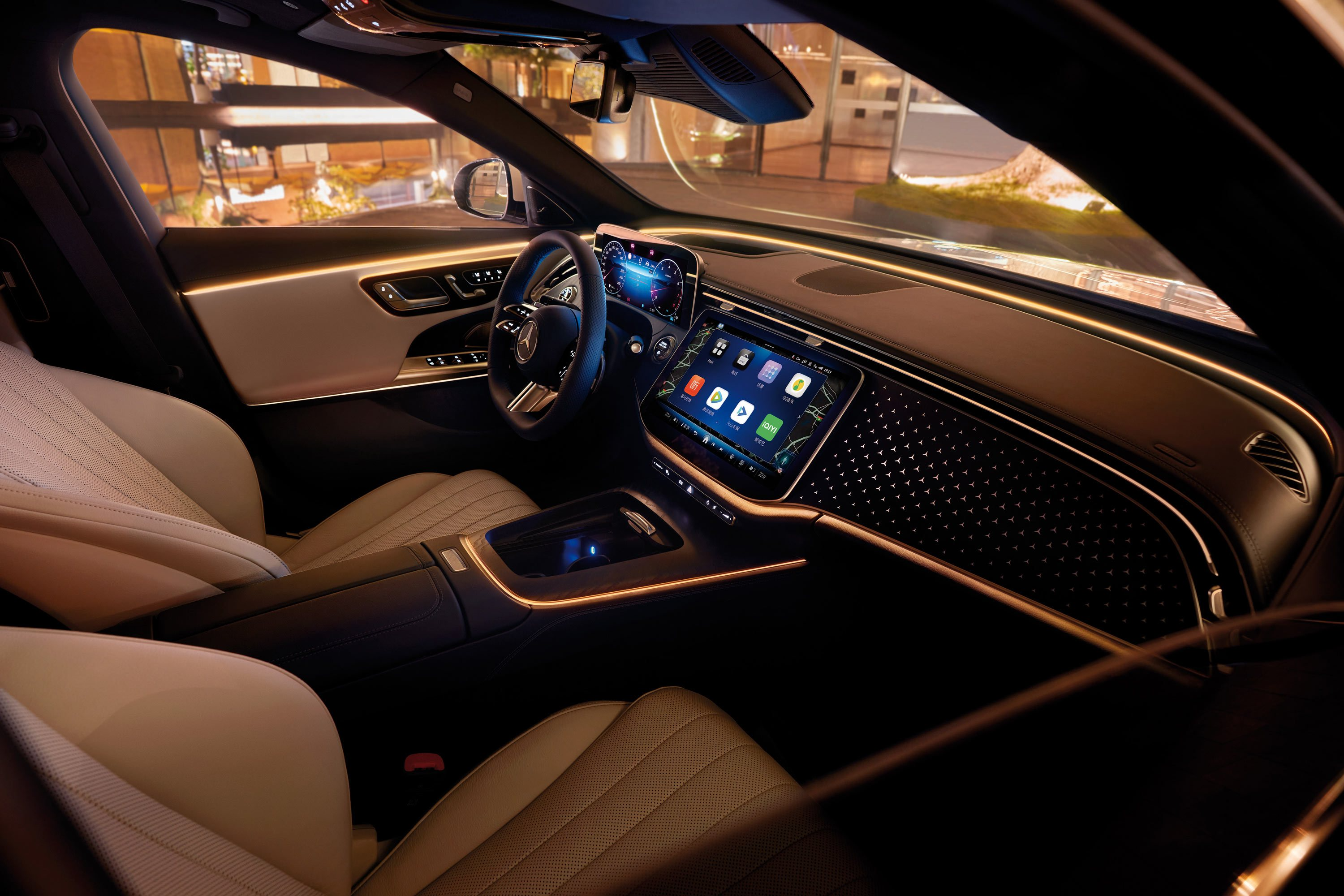 Топ-комплектации китайской версии Mercedes-Benz E-Class теперь оборудованы матричными светодиодными фарами, расширенным набором ассистентов, голосовым управлением и продвинутой медиасистемой с дополненной реальностью и гиперэкраном. Более простое исполнение показано на фото ниже. Хотя эти опции изначально были доступны в Европе, они пришли в Китай с некоторым запозданием.