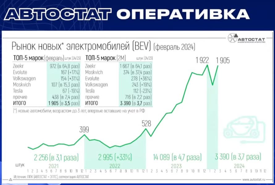 На втором месте Evolute, но это лишь 167 машин. В топ-5 вошли также Volkswagen (154 автомобиля), «Москвич» (107 авто) и Tesla (67 машин). Причём если «Москвич» существенно нарастил продажи «Москвича 3е» (в 15 раз!), то продажи Tesla в России снизились на 19%.