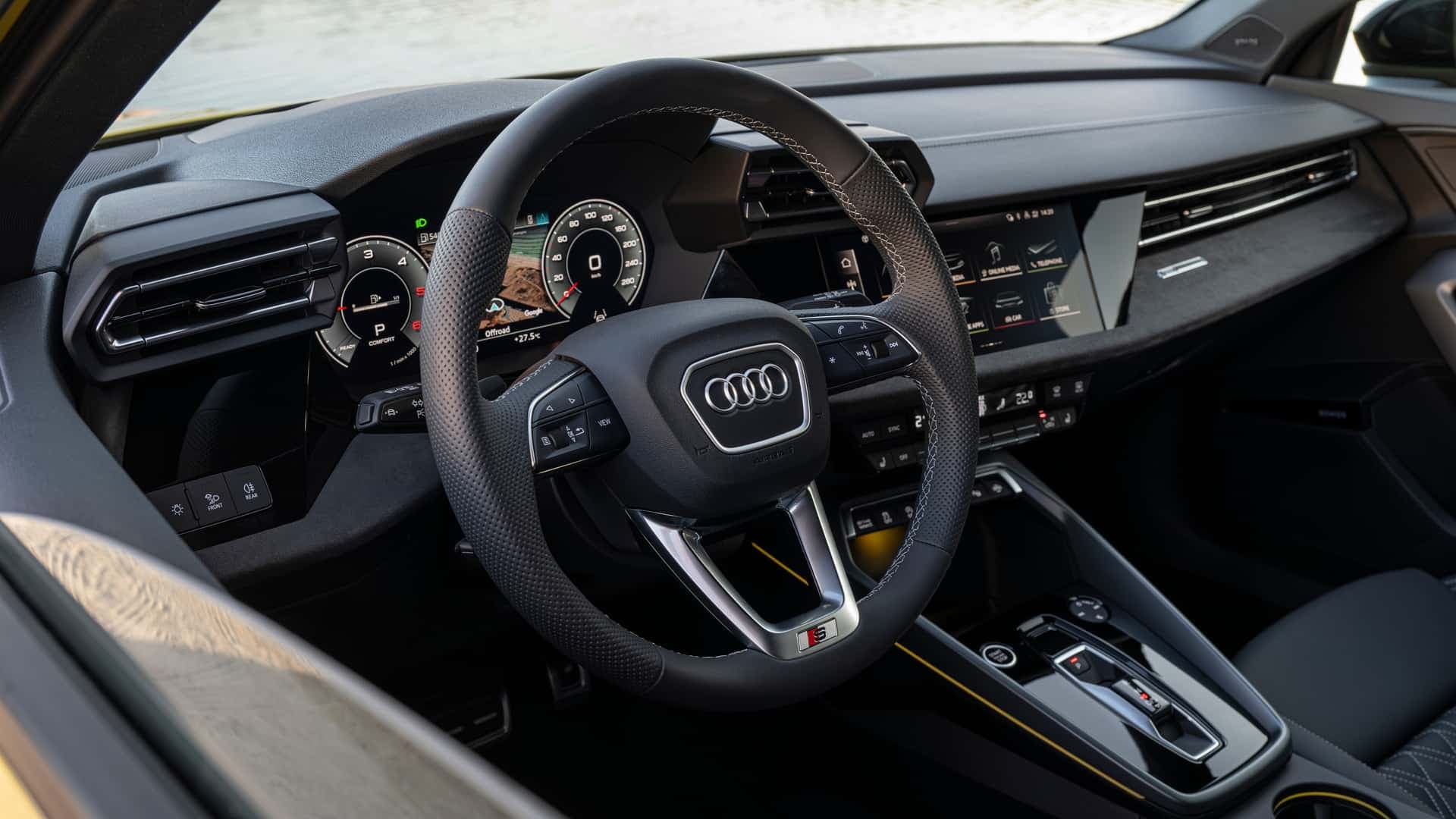 В плане дизайна салон не изменился, сохранилась цифровая приборная панель с экраном диагональю 12,3 дюйма и медиасистема с сенсорным дисплеем диагональю 10,1 дюйма. Миниатюрный рычаг переключения передач стал еще меньше, у дверных карт новая обивка, палитра атмосферной подсветки расширена до 30 цветов.
