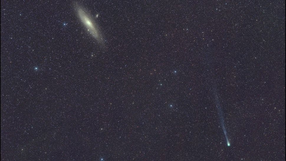 Комета 12P/Pons-Brooks, мчащаяся в сторону Земли, в настоящее время проносится на фоне соседней галактики Андромеды, вызывая интерес астрономов и создавая благоприятные условия для создания захватывающих астрофотографий. Эта комета шириной 17 километров, также известная как «комета Дьявола», вращается вокруг Солнца по эллиптической орбите каждый 71 год. Эта криовулканическая (ледяная) комета извергается, когда солнечная радиация раскалывает её ледяную оболочку, или ядро, из-за чего происходит выброс смеси льда и газа — криомагмы. Когда это происходит, криомагма расширяет кому 12P, формируя облако газа и пыли вокруг ядра, и в результате она выглядит намного более яркой в течение нескольких дней.