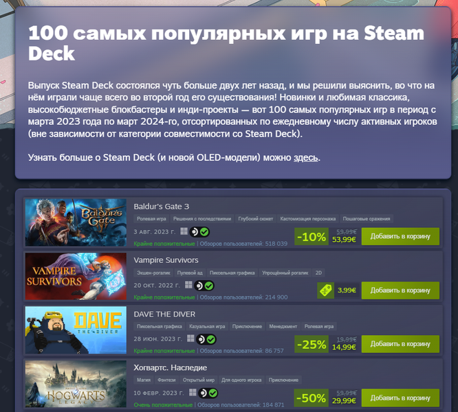 Компания Valve опубликовала список 100 самых популярных игр на портативной приставке Steam Deck за прошедший год: с марта 2023 года по март 2024 года.