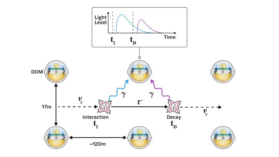Астрофизические тау-нейтрино взаимодействуют с молекулами льда и создают характерное излучение, включая двойное каскадное событие, проявляющееся двумя пиками, которые обнаруживают DOM.