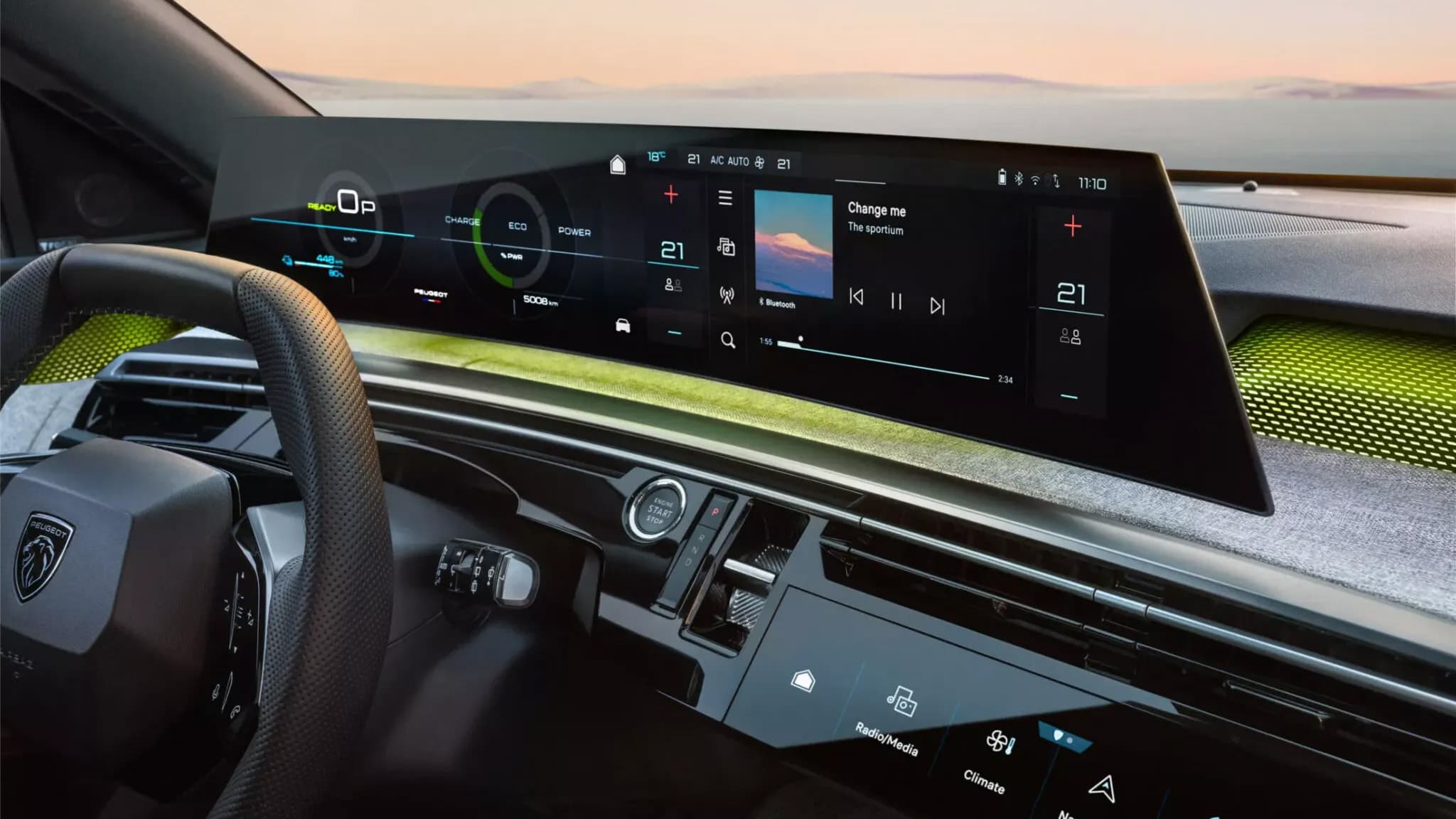 Оформление передней панели и центрального тоннеля — чистый авангард. Французы даже нашли новое исполнение для переключателя режимов КПП, он выполнен в виде колеса и размещён справа от руля. В топовой версии (как на картинках) — 21-дюймовый изогнутый экран, в базе — два 10-дюймовых экрана. Подобно авто Volkswagen, в Peugeot 5008 пропишется умный помощник на базе ChatGPT.