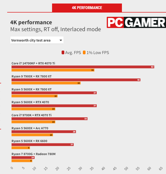 Что интересно, из-за этой особенности переход в разрешение 4K очень слабо сказывается на производительности, что можно оценивать как плюс. К сожалению, у авторов из PC Gamer не оказалось Core i9-14900K или Ryzen 7 7800X3D, чтобы оценить производительность с этими самыми мощными в игровом плане CPU.