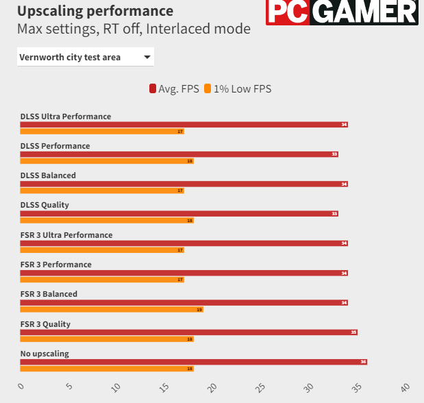 Из-за упора в процессор апскейлеры практически не работают. Ни DLSS, ни FSR не дают особого прироста вне зависимости от режима качества. При этом генерация кадров не поддерживается.