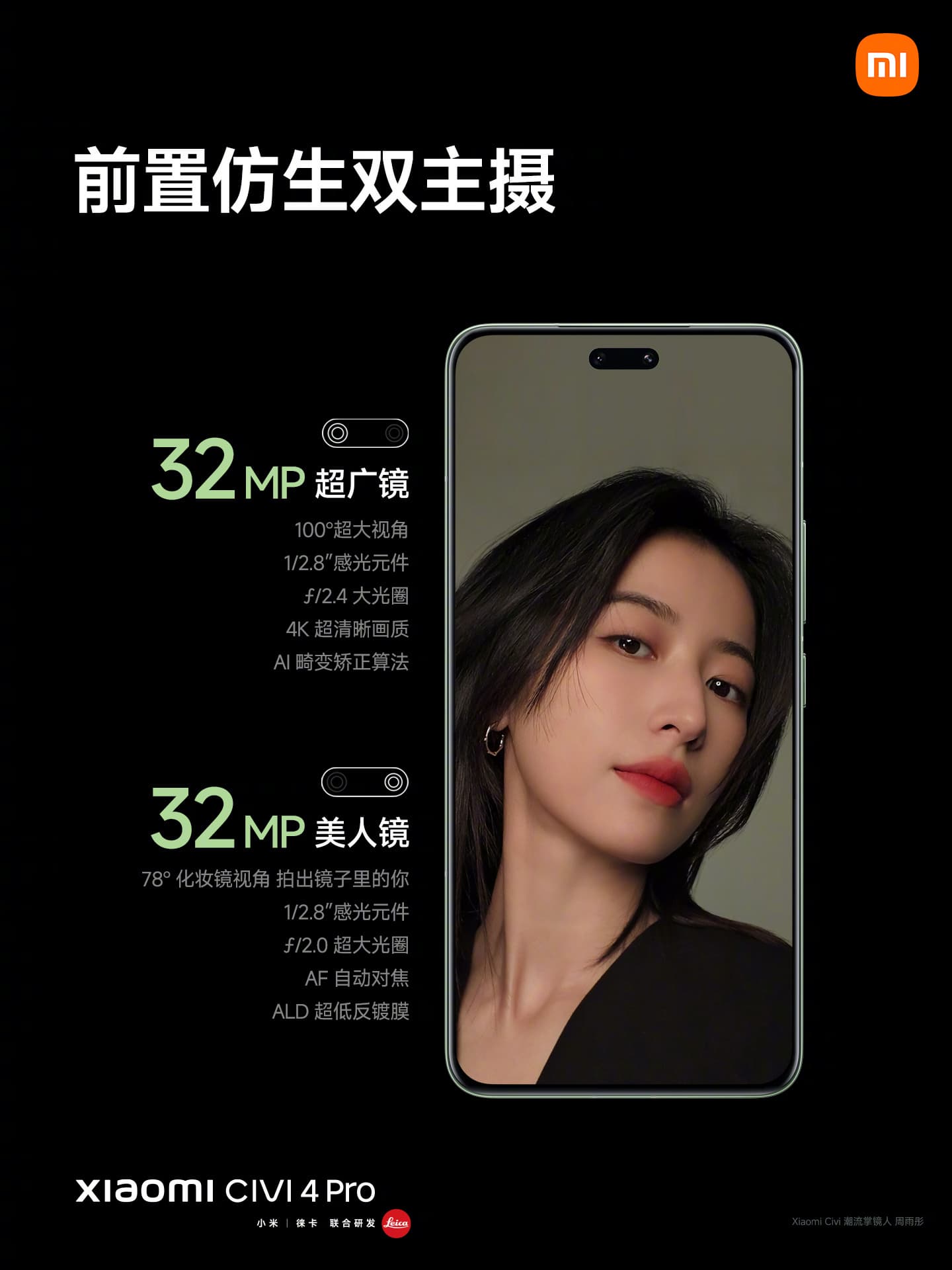 В Xiaomi Civi 4 Pro акцент сделан на обеих камерах. Во фронтальной система из двух модулей с 32-мегапиксельными сенсорами и объективами с углом обзора 78° и 100°.