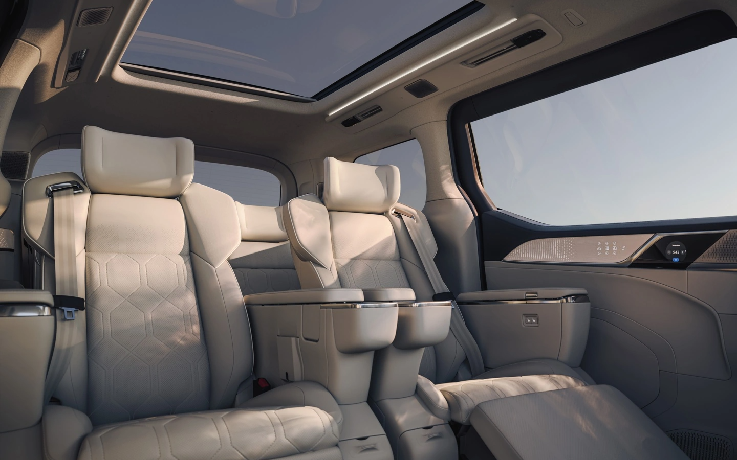 В шестиместной модели MPV сиденья второго ряда EM90 имеют семислойную конструкцию. Они обеспечивают массаж, вентиляцию и подогрев. Также есть встроенные столики-подносы и подстаканники.