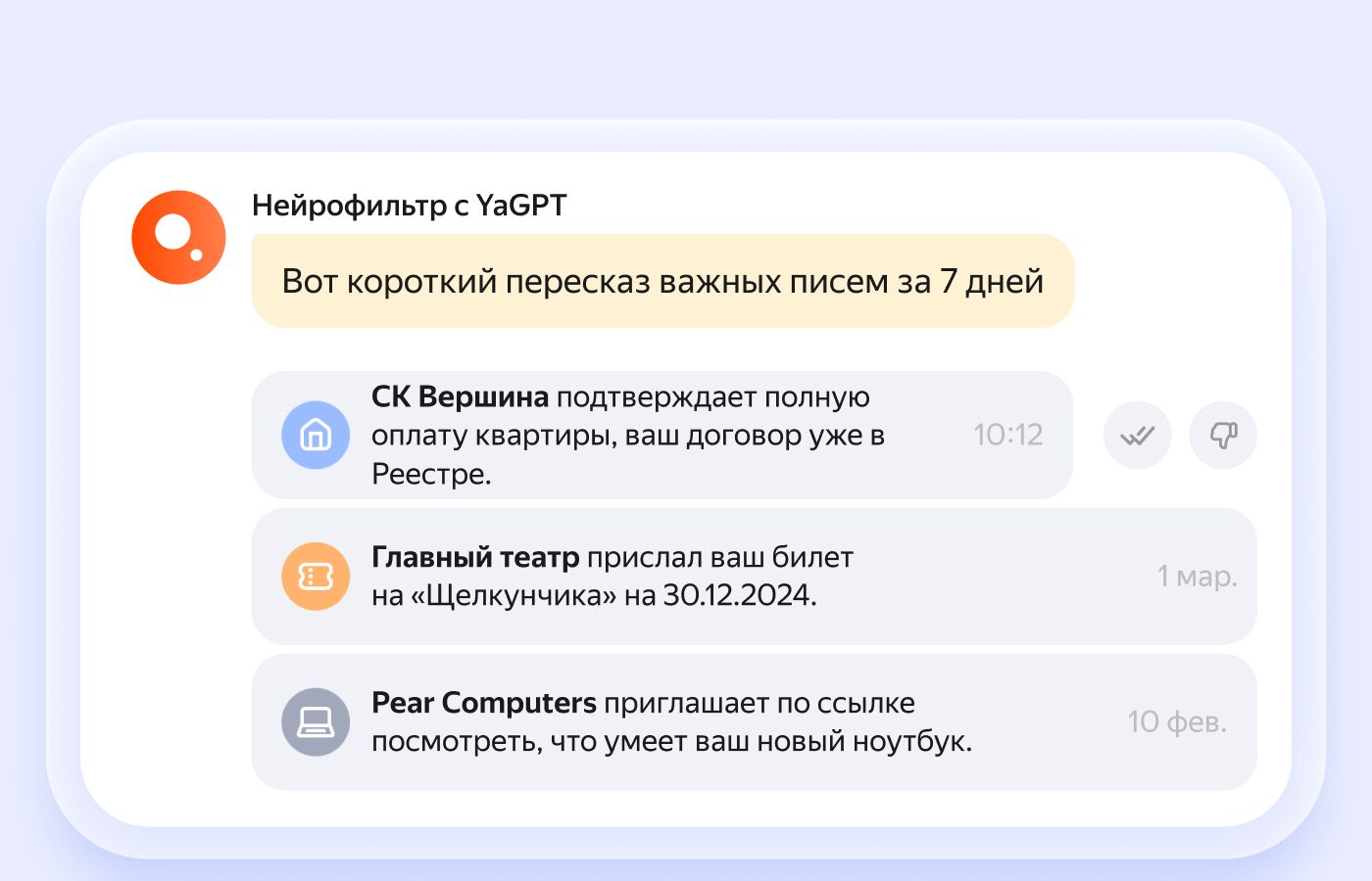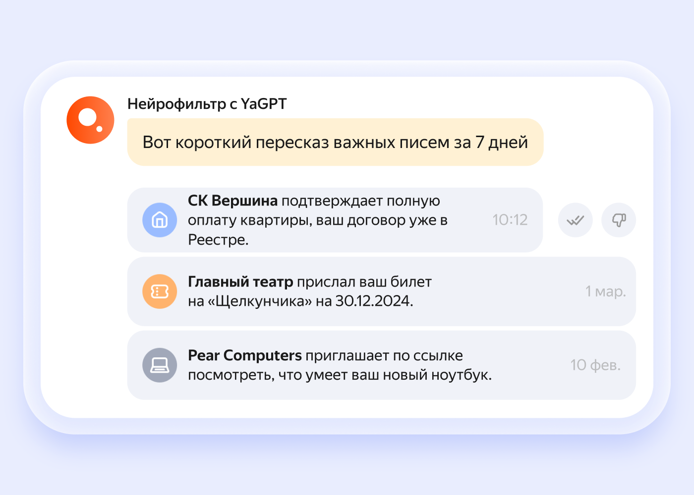 Команда Яндекса объявила о расширении функциональности универсального набора сервисов «Яндекс 360» для работы. В фирменной «Почте» стала доступна умная функция «Нейрофильтр» на основе нейросети YandexGPT, что позволяет создавать дайджест самых важных входящих писем за последнюю неделю.