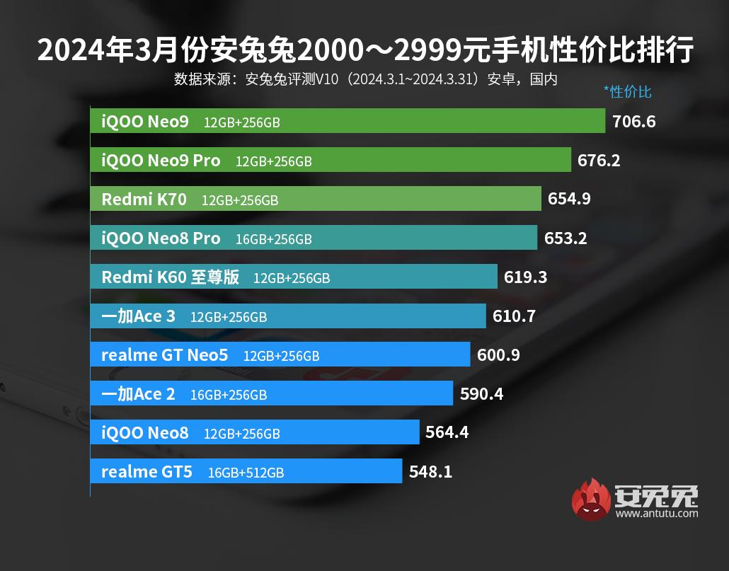 В категории от 2000 до 2999 юаней (от 277 до 414 долларов) первое место занимает iQOO Neo9, второе — iQOO Neo9 Pro. Третье место досталось Redmi K70.