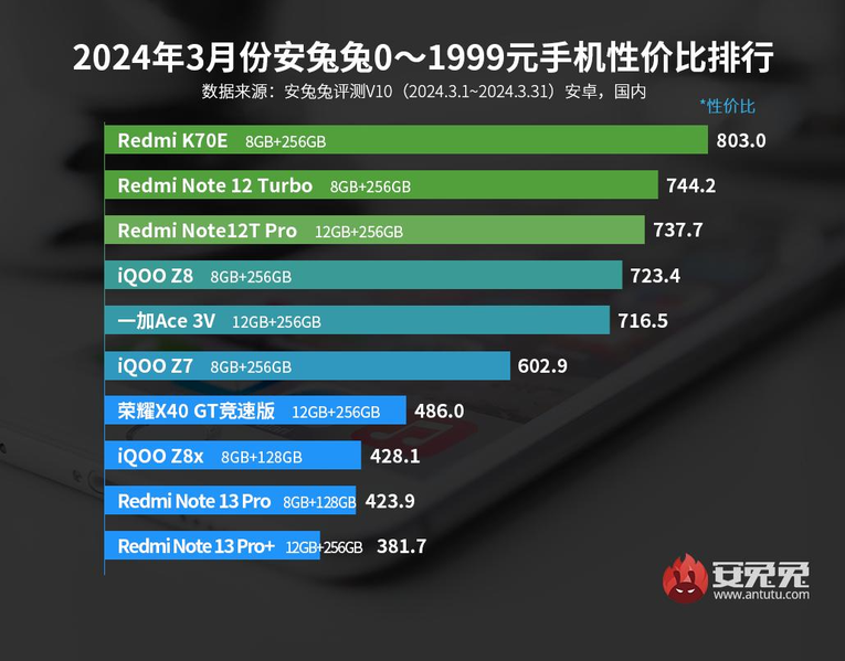 В самой дешёвой категории до 1999 юаней (до 276 долларов) на первое место вновь вернулась модель Redmi K70E, которая лидировала в декабре и январе, а в феврале опустилась на второе место. При этом второе и третье места по итогам марта занимают Redmi Note 12 Turbo и Redmi Note 12T Pro.