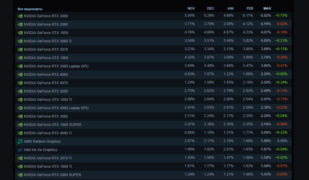 Также стоит отметить, что RTX 4060 активно набирает обороты и уже занимает восьмое место с долей 2,56%, а следом идёт RTX 4070 с 2,5%.