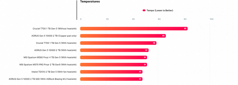 Интереснее посмотреть на эффективность СО. Напомним, некоторые современные SSD оснащены небольшими вентиляторами, которые зачастую весьма шумные. Тут же система пассивна, хотя за это приходится платить габаритами.
