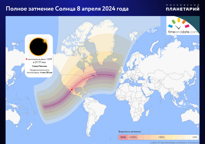 В ближайшие дни жители Земли станут свидетелями интересного астрономического явления. 8 апреля 2024 года с 19:39 и до 22:55 по московскому времени произойдёт полное затмение Солнца с максимальной фазой 1,029 в 21:17 и длительностью полной фазы 4 минуты 28 секунд. Об этом рассказала пресс-служба Московского планетария.