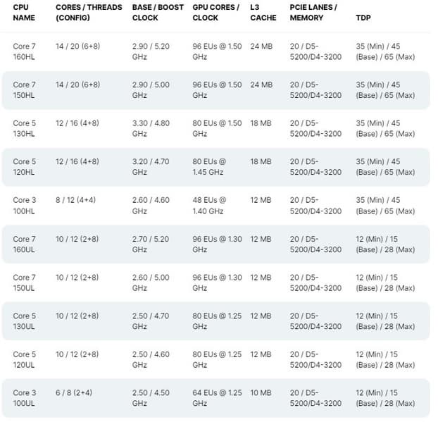 Они уже относятся к семейству Core, а не Core i, но технически никаких изменений нет. Всего в линейке 10 моделей от Core 3 100UL до Core 7 160HL.