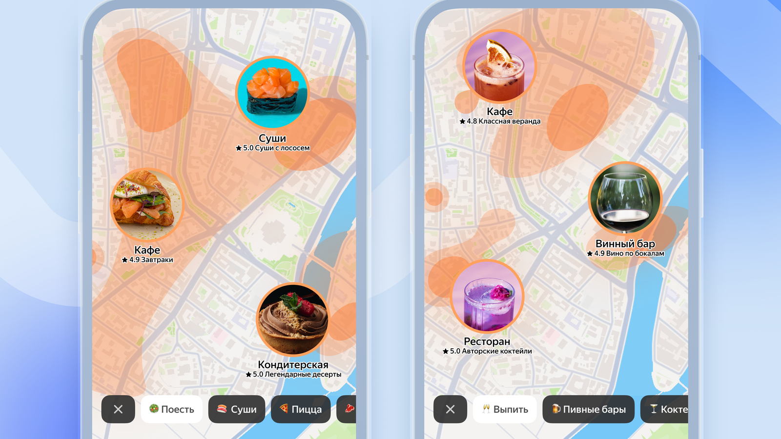 Изучая карту с идеями, можно указать, как именно хочется провести время, нажав кнопку: «Поесть», «Перекусить» или «Выпить». Дальше можно уточнить пожелания и получить подборку мест, куда лучше сходить «Вдвоём» или «Большой компанией», а также где есть «Суши», «Бургеры» или «Коктейли».