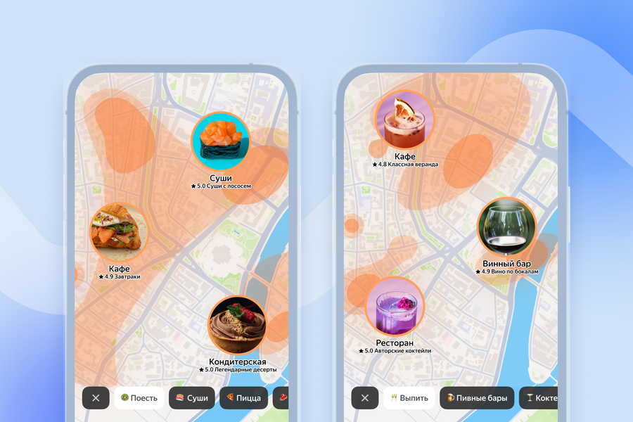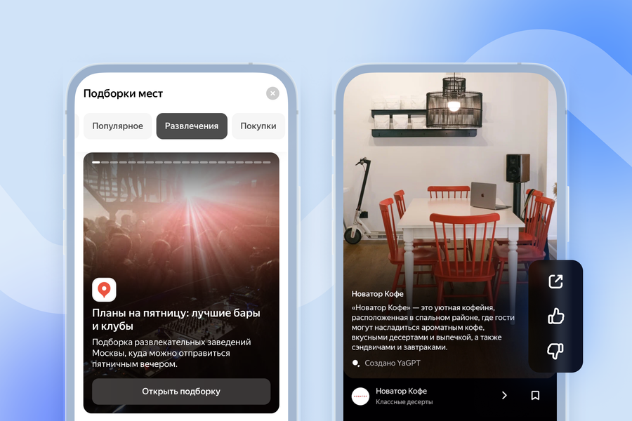 На её основе в мобильном приложении заработал новый режим — «Идеи». Он находится прямо на главном экране и в разных форматах показывает пользователям персональные рекомендации. «Идеи» помогут исследовать город в поисках нового или спланировать вечер — для этого не придётся искать вдохновение в различных соцсетях или спрашивать мнения других. На первом плане в «Идеях» — карта города, на ней подсвечены области с местами, которые могут понравиться пользователю. Чем подсвеченная область ярче, тем больше там рекомендаций.