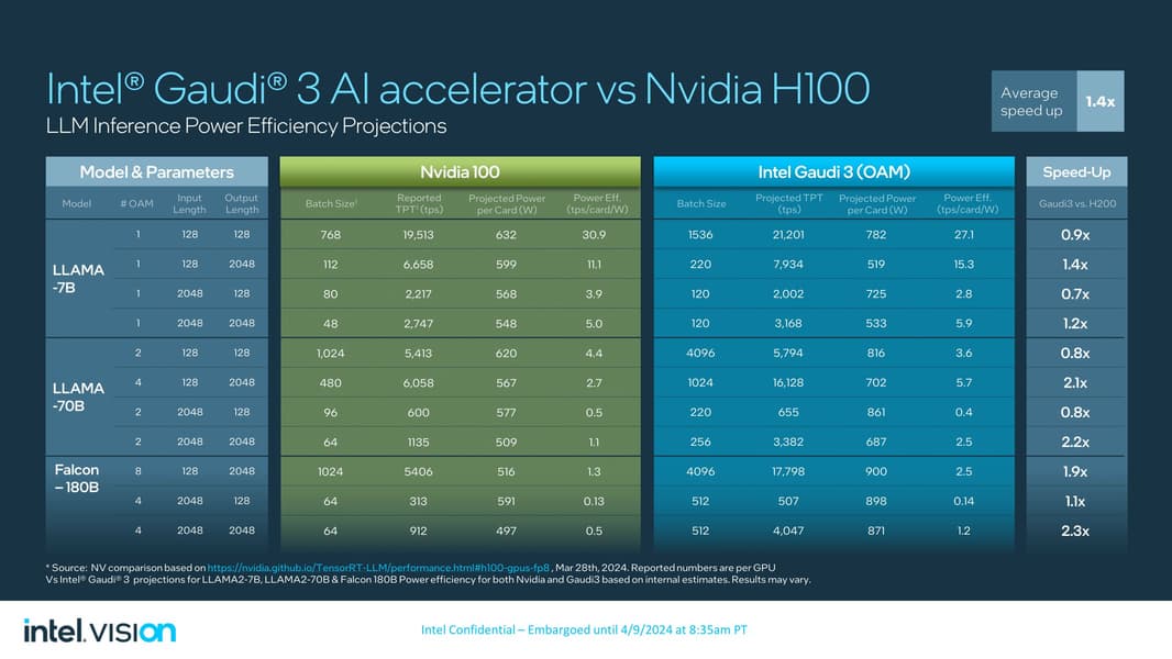 Intel, конечно, проводит сравнение Gaudi 3 с Nvidia H100. По чистой производительности в зависимости от задач Gaudi 3 либо немного медленнее, либо ощутимо быстрее, но при этом якобы более чем вдвое энергоэффективнее. Правда, нужно помнить, что Nvidia уже представила поколение Blackwell.