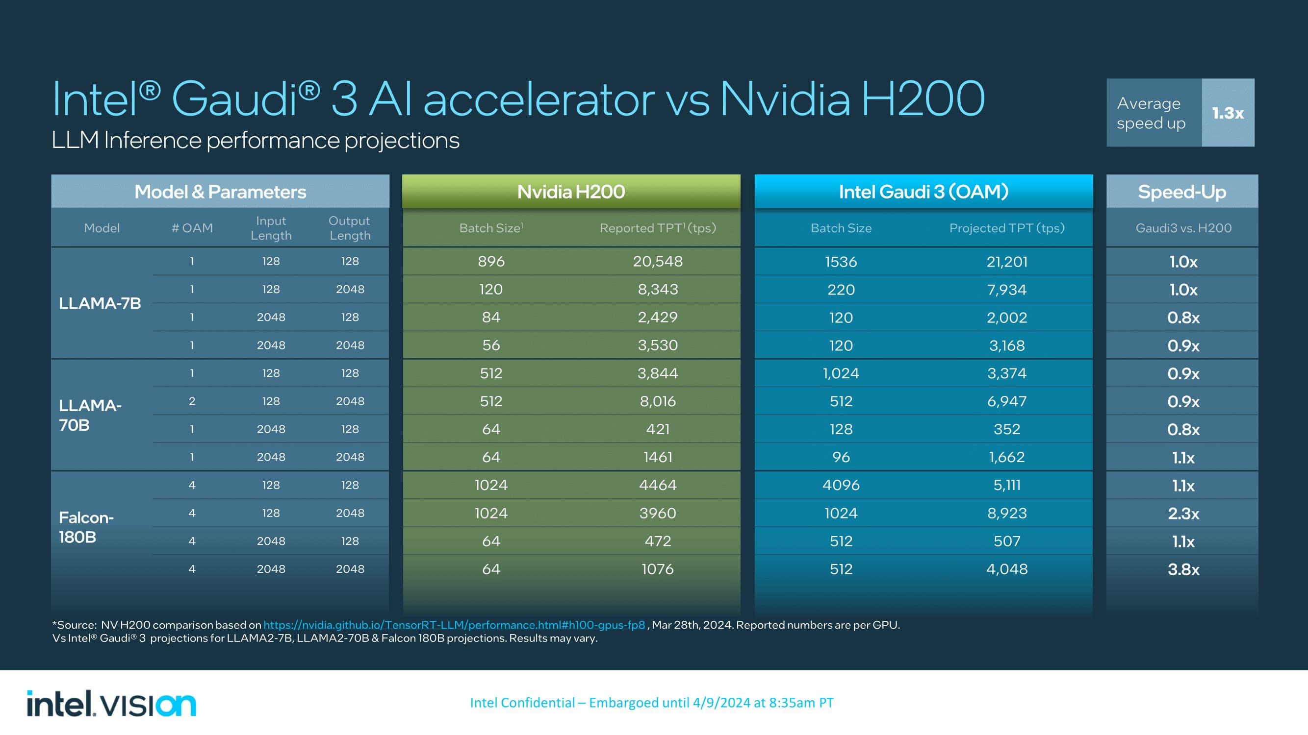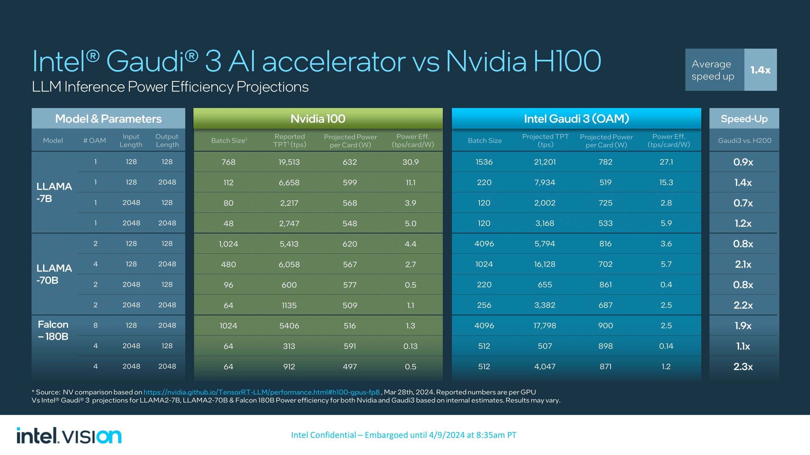 Теперь к производительности. Версия HL-325L, для которой Intel делится данными, имеет производительность в режиме FP8 в 1835 TFLOPS, то есть почти в 2 PFLOPS. Это двое больше, чем у Gaudi 2. В режиме BF16 новинка и вовсе вчетверо быстрее.