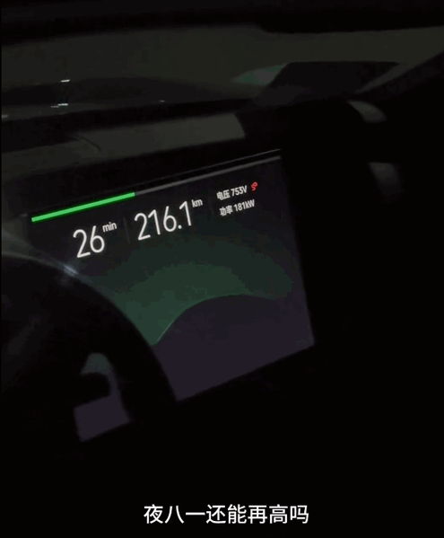 Когда на экране бортового компьютера отображался запас хода 216 км, оставшееся время зарядки составило всего 26 минут. На тот момент потребляемая мощность составляла 181 кВт, напряжение зарядки — 753 В.