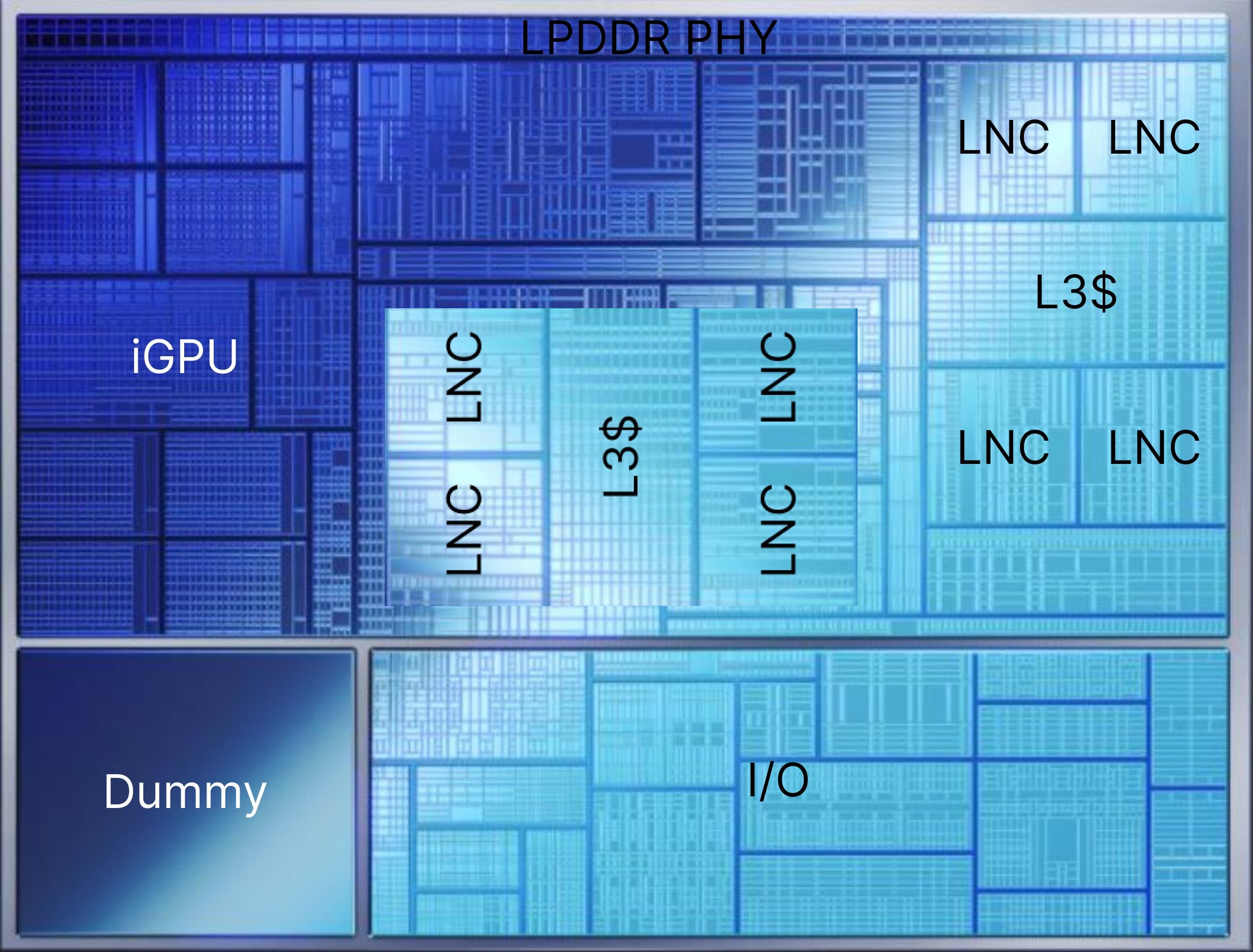В отличие от Meteor Lake, Lunar Lake состоит всего из двух кристаллов. Один совмещает CPU и iGPU, а другой представляет блок ввода-вывода. Есть ещё третий кристалл, но это фактически заглушка для создания нормальной прямоугольной формы чипа в целом. Правда, неясно, почему Intel не использовала это место с пользой.