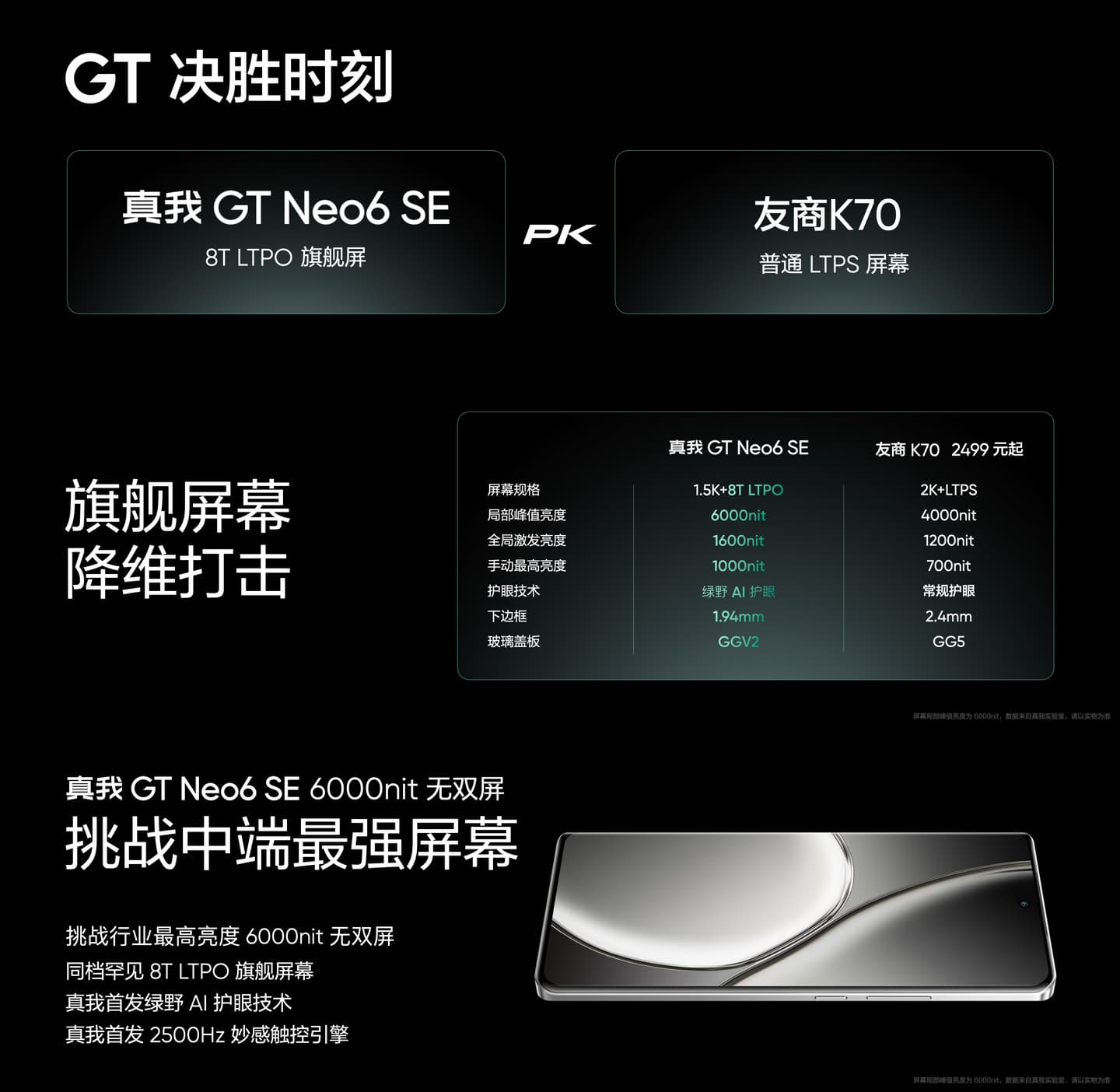 Realme представила на домашнем рынке смартфон Realme GT Neo6 SE. Устройство получило экран BOE с рекордной (локальной пиковой) яркостью 6000 кд/кв.м. Но максимальная яркость всего экрана в 6 раз меньше. Диагональ составляет 6,78 дюйма, разрешение —2780 × 1264 пикселей. Частота регулировки ШИМ — 2160 Гц. Защиту дисплея обеспечивает закаленное стекло Gorilla Glass Victus 2, что нетипично для его ценовой категории.