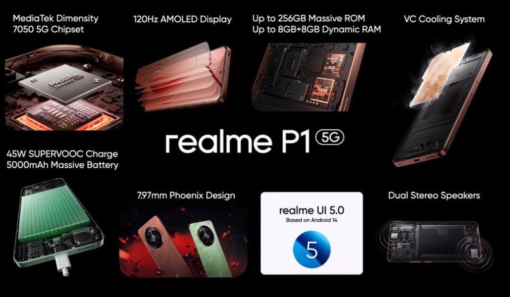 Realme P1 и P1 Pro оснащены 6,7-дюймовыми дисплеями AMOLED с разрешением Full HD+ и частотой обновления изображения 120 Гц. Модель Pro оснащена изогнутым дисплеем, а P1 — плоской панелью. Оба получили основную камеру на 50 Мп, фронтальную камеру на 16 Мп и встроенный под дисплей сканер отпечатков пальцев, аккумулятор 5000 мА·ч с поддержкой быстрой зарядки мощностью 45 Вт, оболочку Realme UI 5.0 на базе операционной системы Android 14. Realme P1 оснащён SoC MediaTek Dimensity 7050, а P1 Pro — Qualcomm Snapdragon 6 Gen 1 SoC.