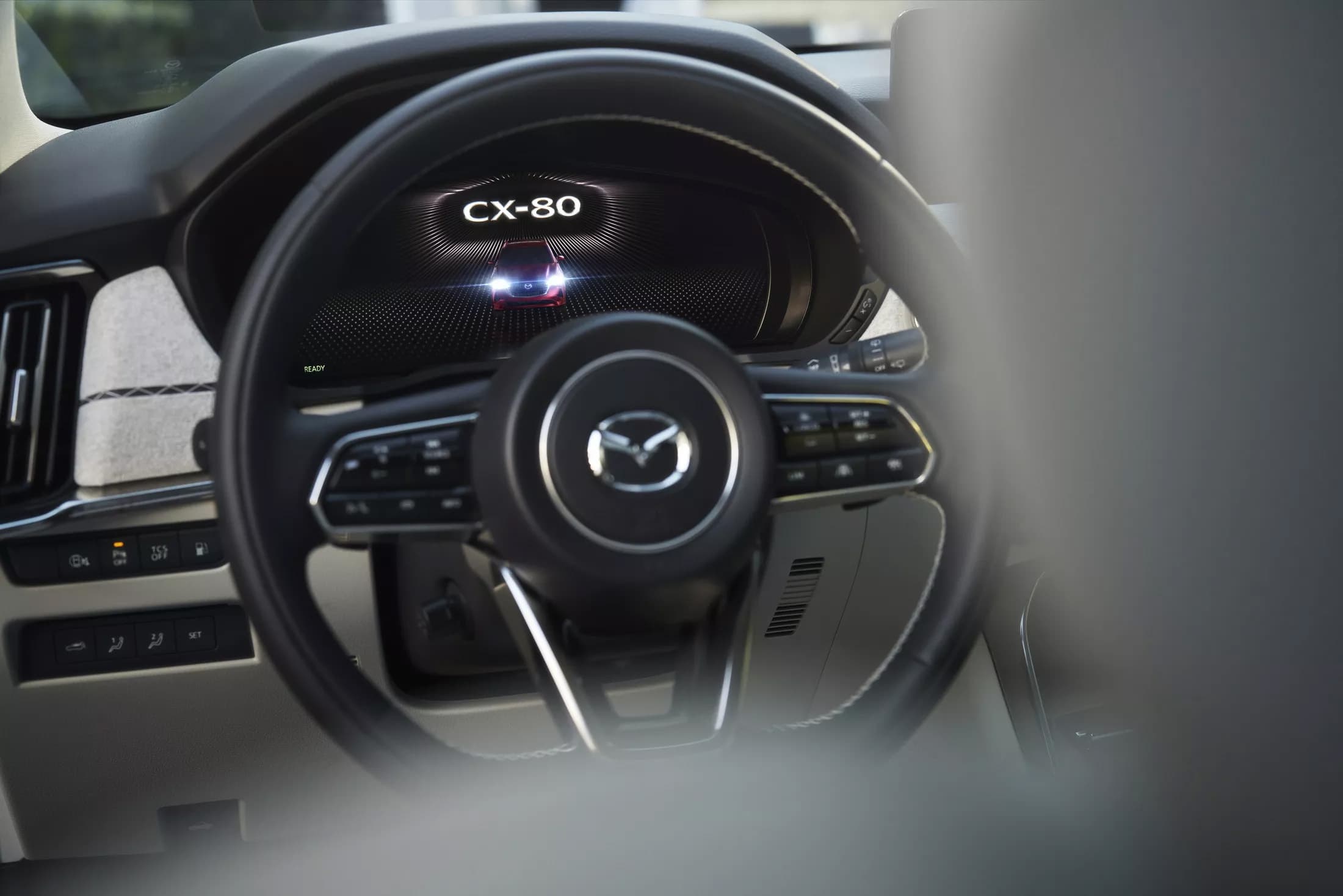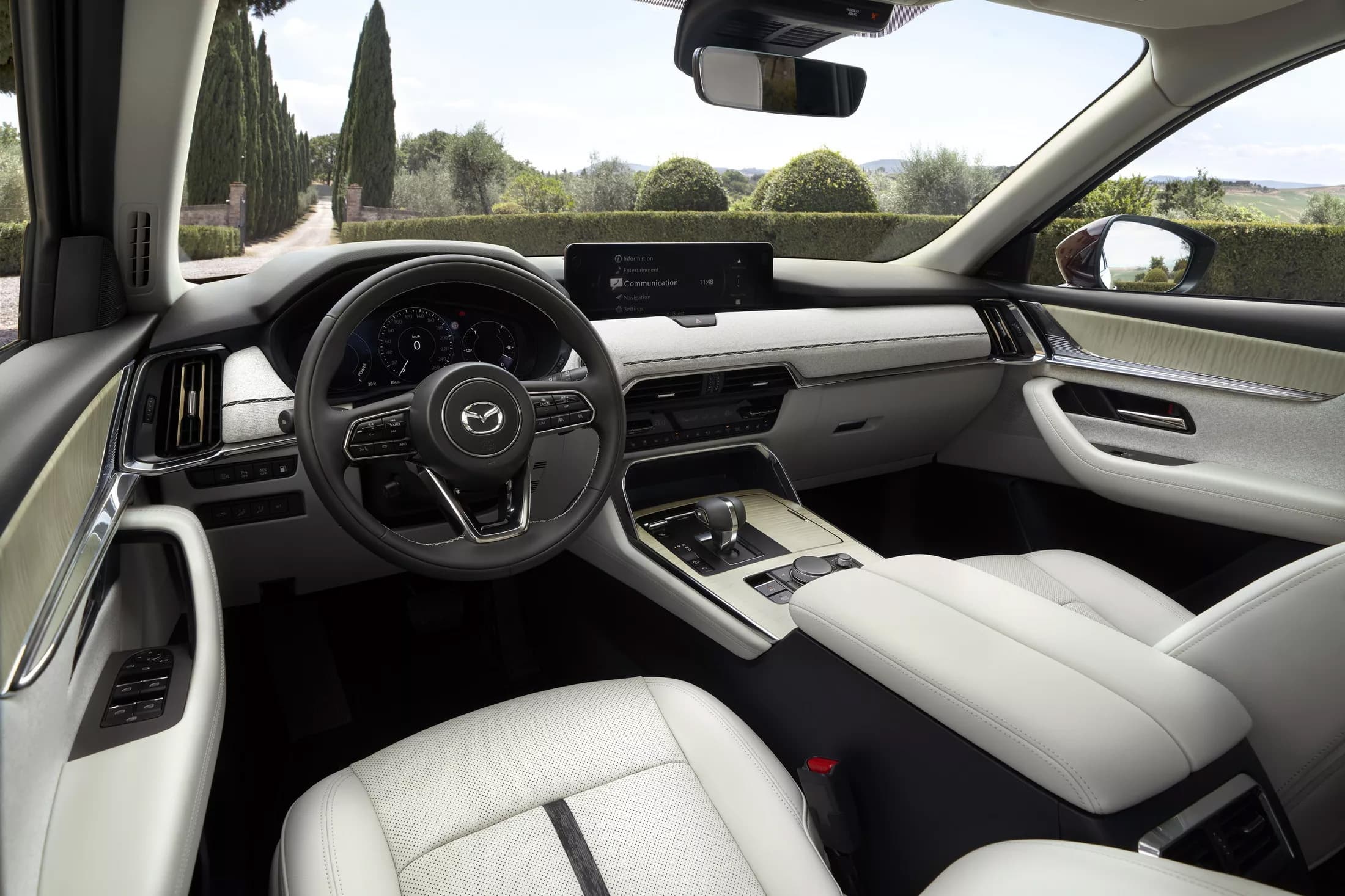Mazda CX-80 может быть как 6-, так и 7-местным. Передняя панель заимствована у CX-60, но материалы отделки другие, более качественные, а медиасистема самой современной версии, с голосовым помощником Alexa.