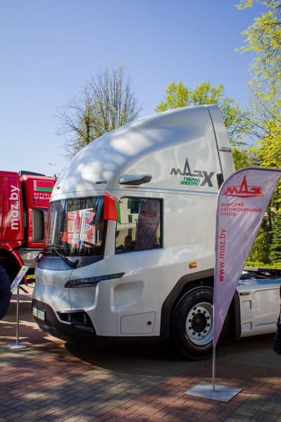Это гибридный грузовик с гибридной силовой установкой, состоящей из 300-сильного китайского дизеля Weichai и двух электромоторов. MAZ-X отличается не только передовой силовой установкой, но и необычного вида кабиной с единственной прислонно-сдвижной водительской дверью. У машины односкатная ошиновка ведущей оси и 4-точечная пневмоподвеска заднего моста.