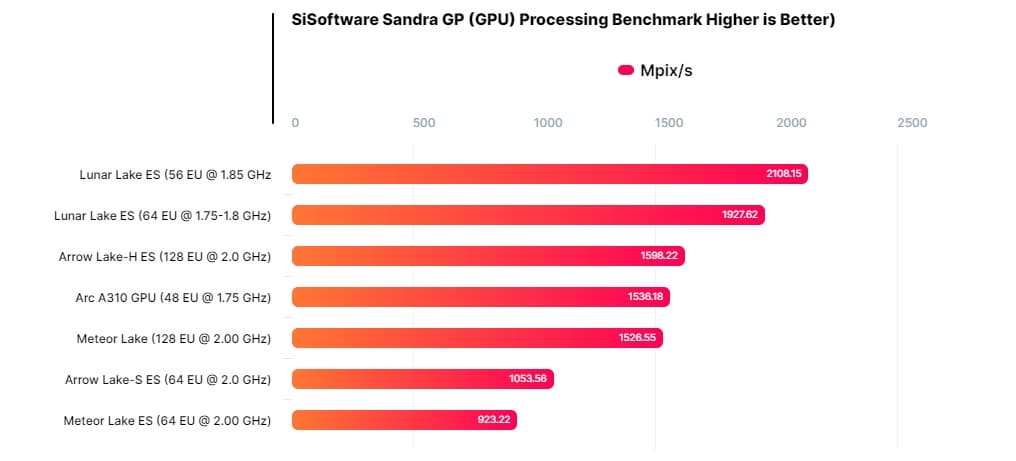 Относительно текущих Meteor Lake прирост составляет почти 40%. И это при вдвое меньшем количестве ядер. Напомним, iGPU Lunar Lake опирается на новую архитектуру Battlemage. Конечно, Sandra — сугубо синтетический бенчмарк, но в любом случае мы видим внушительный прирост производительности.