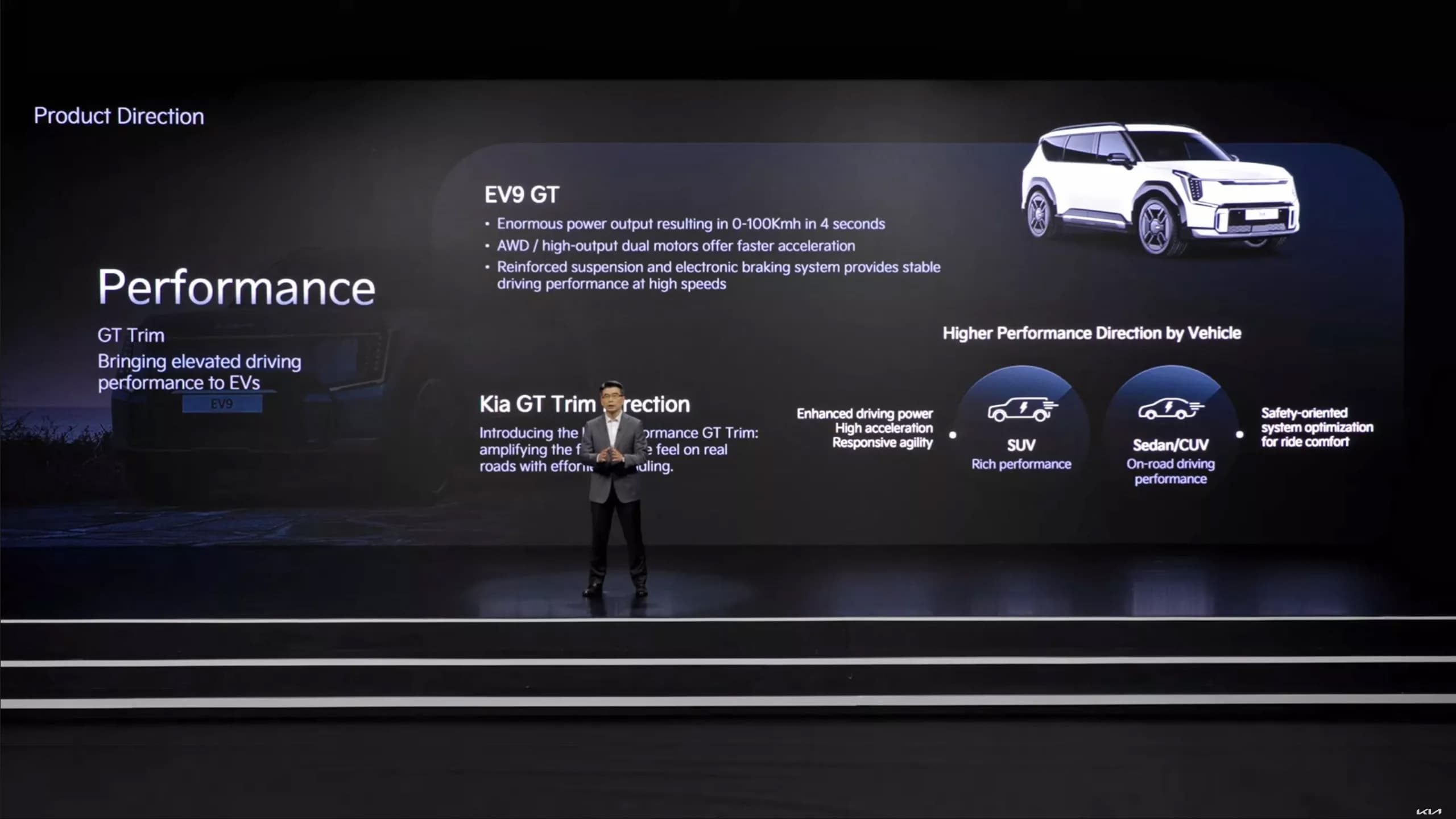 Сколько именно мощности будет у Kia EV9 GT, пока можно только гадать, но не исключено, что в нем пропишется 576-сильная силовая установка от Kia EV6 GT. Учитывая, что более компактный и менее тяжелый EV6 GT разгоняется до 100 км/ч за 3,5 с, установка его электромоторов в Kia EV9 GT как раз должна обеспечить заявленную динамику. Также Kia EV9 GT получит иные, более выносливые шины, особые колесные диски и более агрессивную переднюю часть. Выход Kia EV9 GT состоится в январе 2025 года.