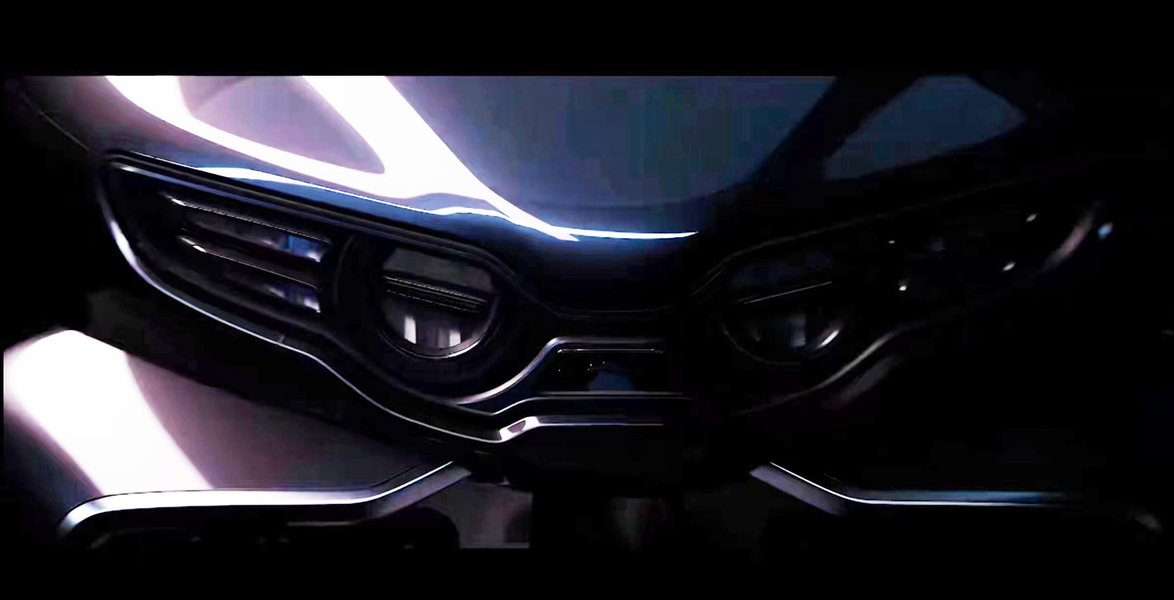 Сбоку передняя часть выглядит высокой, с большим лобовым стеклом. Заднее сиденье оборудовано спинкой и багажником. В профиль новинка напоминает Honda Gold Wing и BMW K 1600.