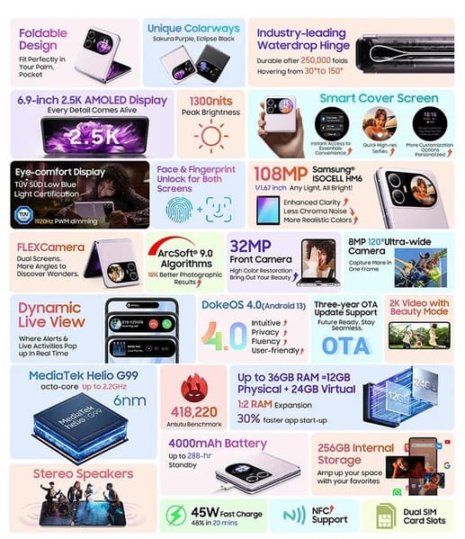 Основной камерой будет 108-мегапиксельный датчик Samsung ISOCELL HM6. Также у смартфона будет сверхширокоугольная камера разрешением 8 Мп и фронтальная разрешением 32 Мп. О SoC Helio G99 мы уже говорили, как и о 12/256 ГБ памяти. Ёмкость аккумулятора составит 4000 мА·ч и будет поддержка 45-ваттной зарядки. Что интересно, у Galaxy Z Flip5 и аккумулятор меньше, и зарядка менее мощная. Из остального можно выделить стереодинамики, NFC и веганскую кожу. Параметров внешнего круглого дисплея нет.