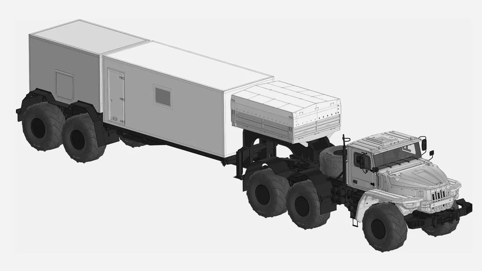 Новых технических подробностей не появилось. Ранее же сообщалось, что у машины шесть ведущих колес (три оси) и запас хода 500 км. Интересно, что у прицепа есть активный привод мощностью 98 л.с., он подключается по требованию и питается от установленного в самом прицепе дизель-генератора. Клиренс машины огромный, она может преодолевать брод глубиной до 1,3 метра. Автопоезд может работать даже при −50 °C.