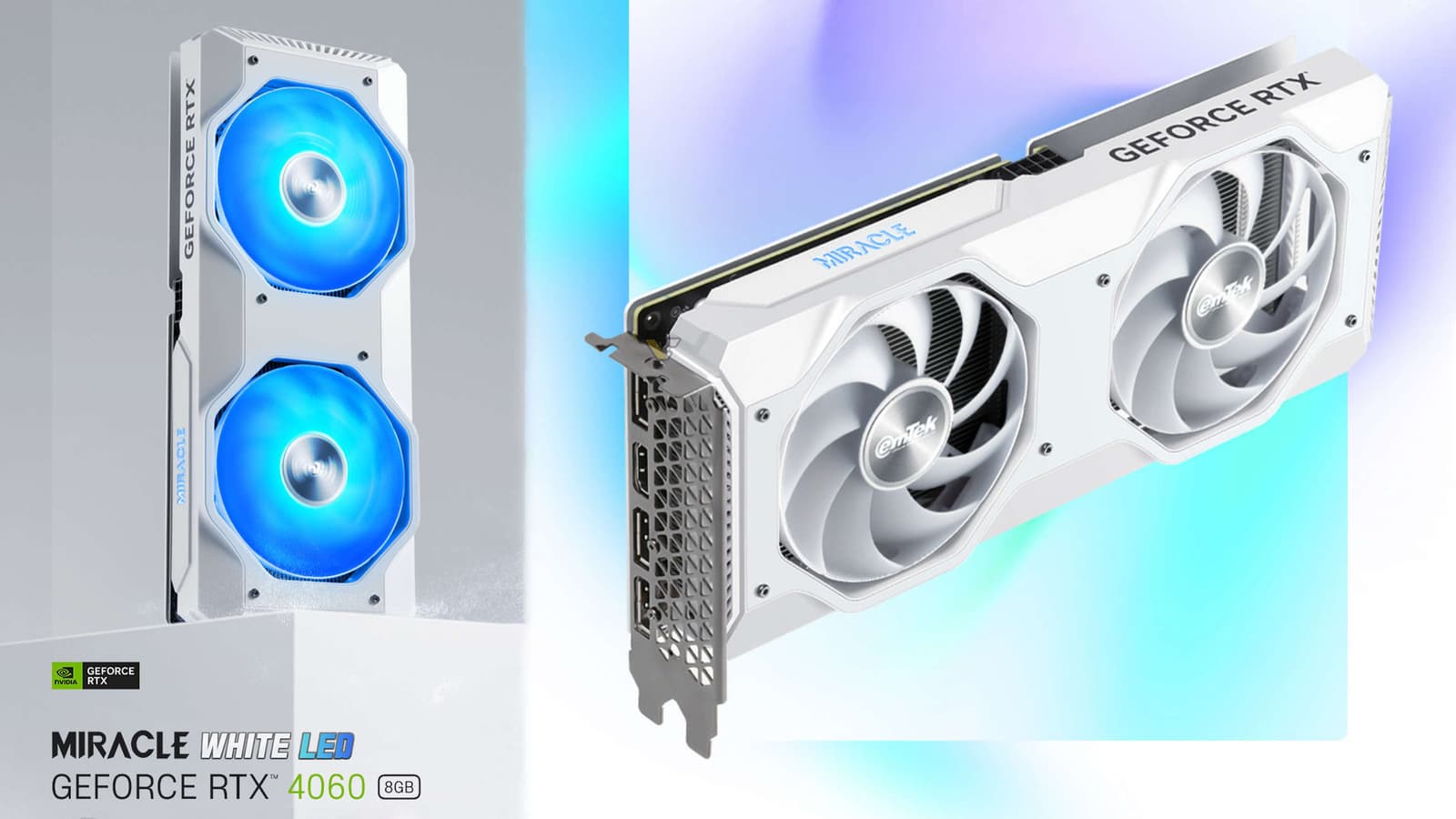 Компания Emtek анонсировала видеокарту GeForce RTX 4060 Miracle, которая выделяется белым кожухом системы охлаждения и ярко-синей подсветкой вентиляторов.