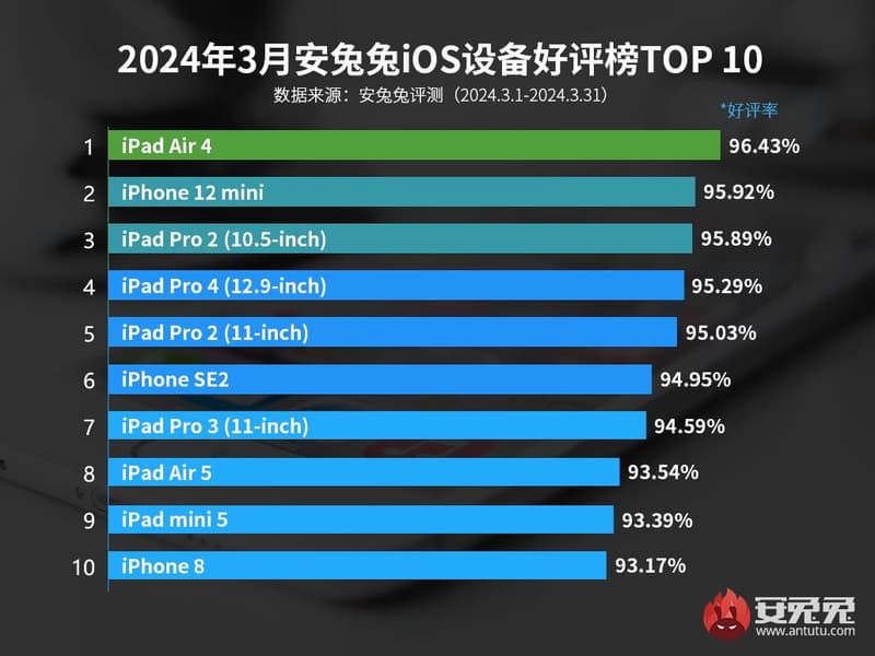 Разработчики бенчмарка AnTuTu опубликовали свежий (апрельский) рейтинг устройств Apple, которыми пользователи довольны больше всего. Лидером в нем стал iPad Air 4: 96,43% пользователей довольны планшетом. В марте iPad Air 4 был на втором месте, а сейчас поднялся на первое.