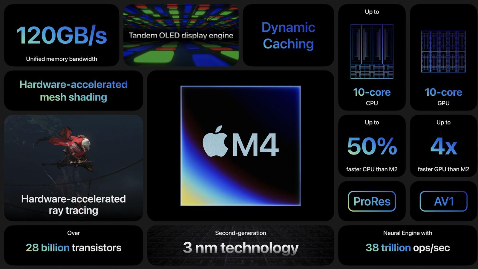 M4 также предлагает пропускную способность памяти в 120 ГБ/с, аппаратное ускорение трассировки лучей и технологию динамического кеширования. А ещё M4 впервые приносит на iPad аппаратное ускорение AV1.