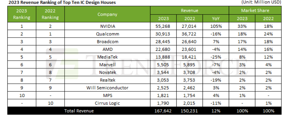 На втором месте оказалась Qualcomm с 30,9 млрд, спадом на 16% и долей 18%. Также в список лидеров входят Broadcom, AMD, MediaTek, Marvell, Novatek, Realtek, Will Semiconductor, MPS и Cirrus Logic. При этом долей свыше 10% могут похвастаться лишь Nvidia, Qualcomm, Broadcom и AMD.