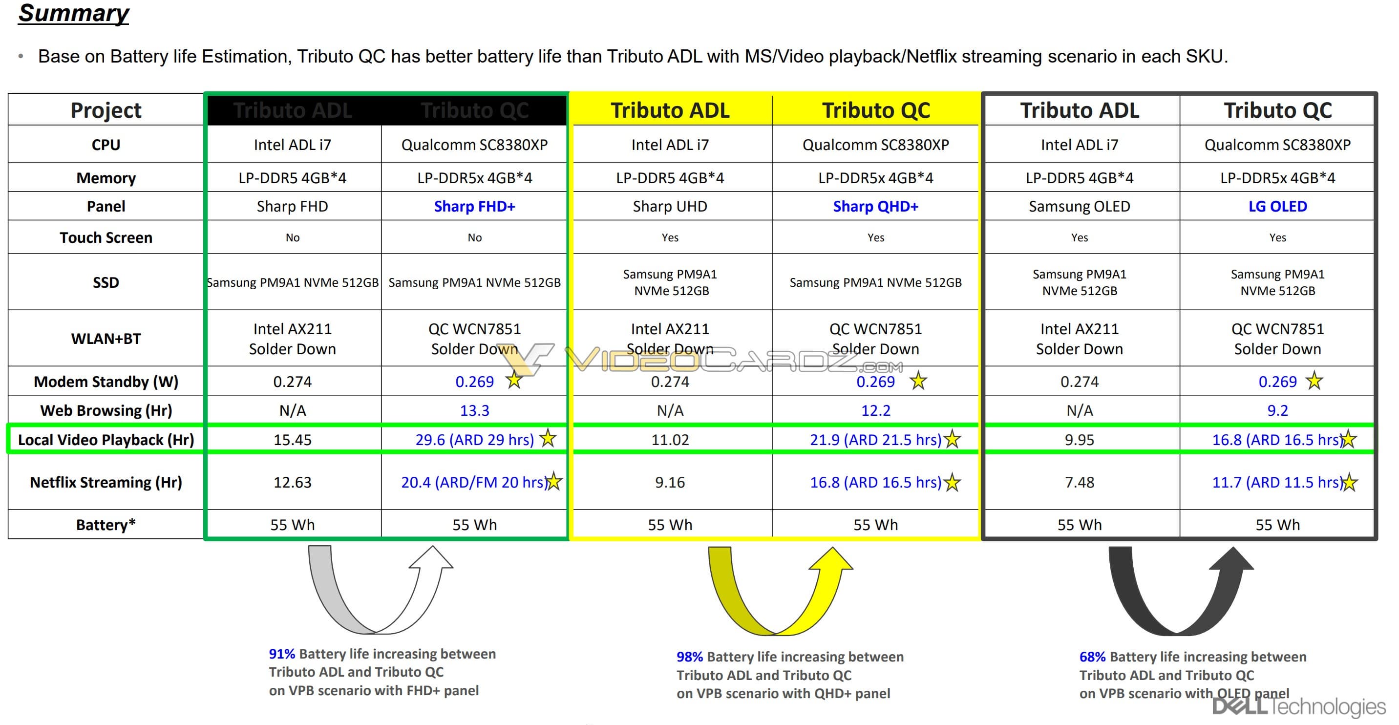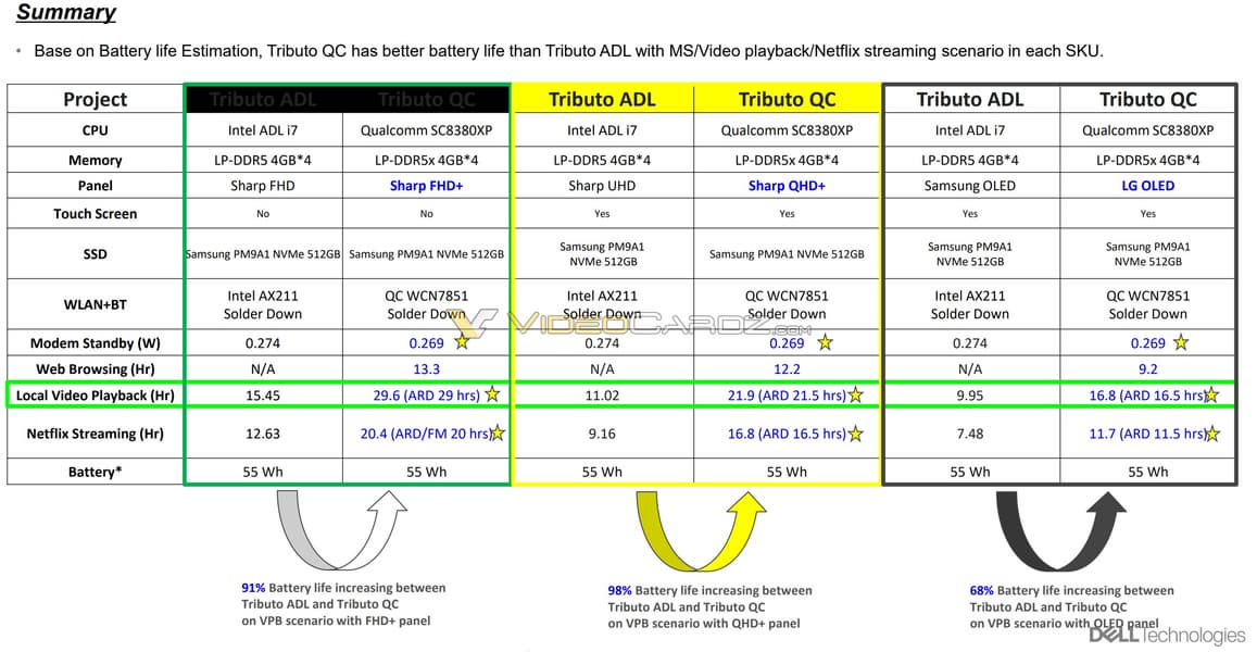 После анонса новых платформ Qualcomm были данные о том, что с энергопотреблением там не всё в порядке, однако по данным внутреннего тестирования Dell автономность версии на Snapdragon X на 68-98% выше, чем у версии на CPU Intel.