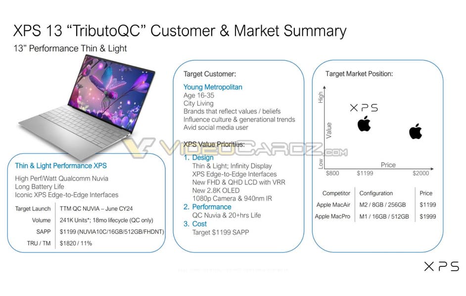 В Сеть попали внутренние документы Dell, сравнивающие ноутбуки XPS 13 на основе процессоров Intel и новейших SoC Snapdragon X.